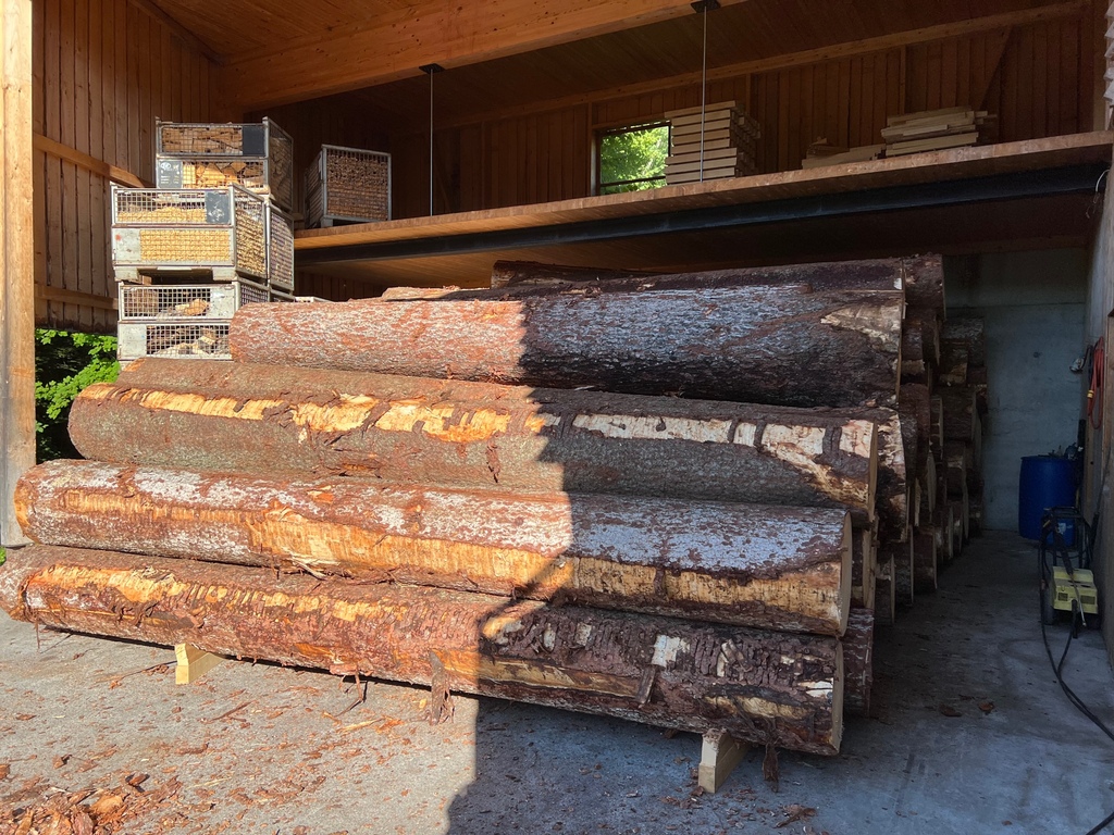 Vorwiegend arbeiten wir mit heimischer Fichte und Bosnienahorn. Diese Holzarten sind für ihre hervorragenden akustischen Eigenschaften bekannt. Wir legen besonderes Augenmerk auf den Umgang mit Holz, das in der richtigen Mondphase geschlagen wurde. So gewährleisten wir die bestmögliche Qualität. Die Auswahl beginnt bereits mit dem Kauf von Rundholz. Dabei lassen wir höchste Sorgfalt walten. Unser Holz wird handverlesen, um sicherzustellen, dass nur die besten Stücke für die Weiterverarbeitung verwendet werden. Diese sorgfältige Auswahl ist entscheidend für die Qualität unserer Endprodukte.